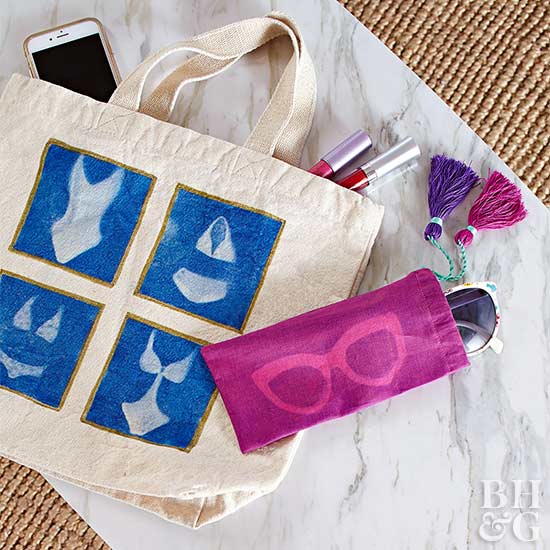 A thin layer of light-sensitive dye applied inside masked-off lines on a blank tote bag turns dark blue, revealing lighter areas where images of swimsuits were laid. Pretreated, light-sensitive fabric, exposed with a paper cutout of sunglasses, is sewn into the drawstring-closure sunglasses case.
